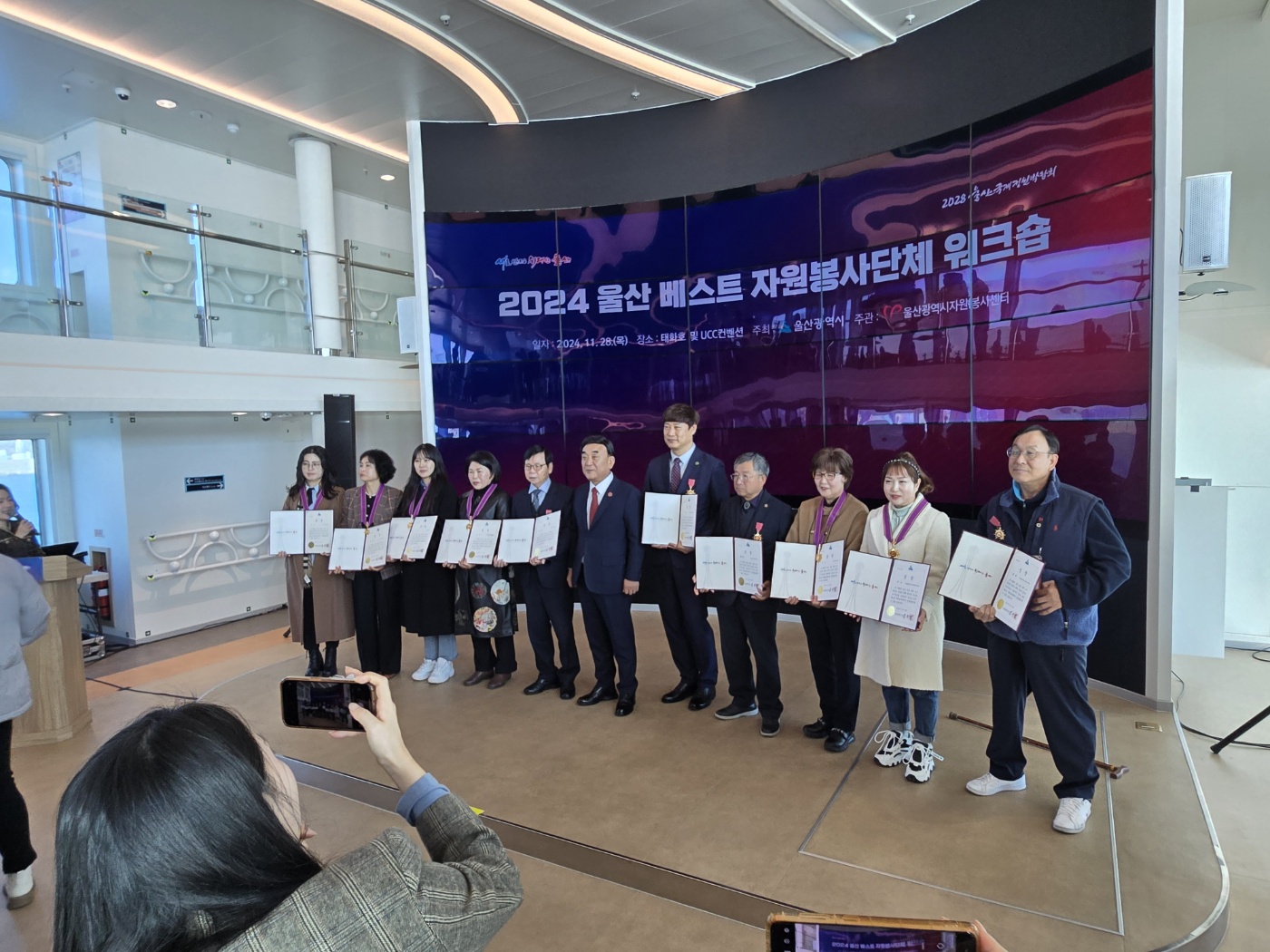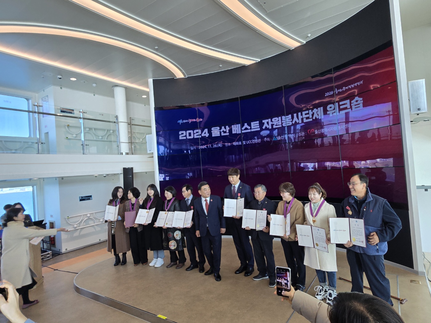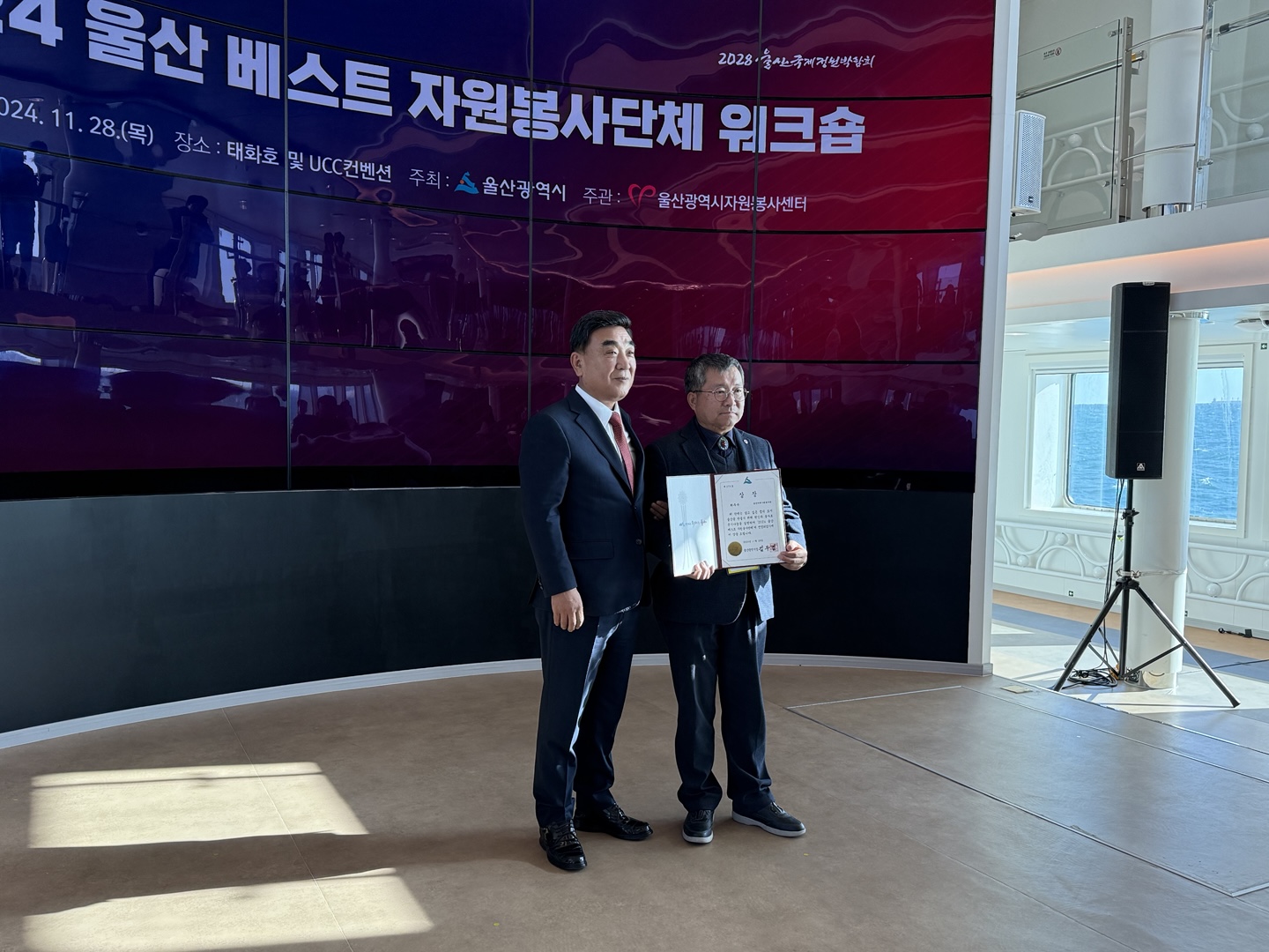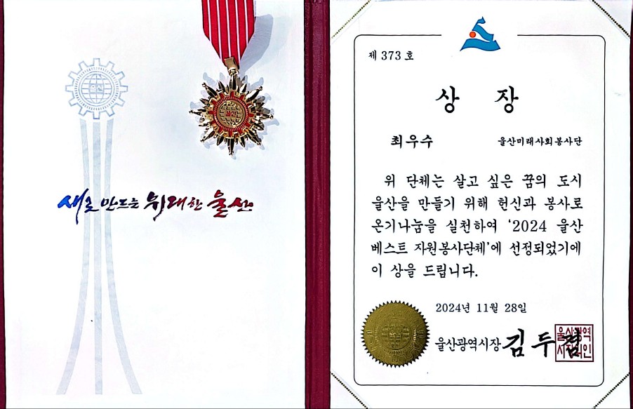 2024.11.28. 이날 장생포에서 수소연료인 지능형선박 울산태화호에서 2024 울산 베스트 자원봉사단체 10곳에 시상식이 있었다. 울산미래사회봉사단은 사랑을 베푸는 사람들(대상) 단체 다음으로 최우수단체에 선정되어 손덕화단장님외 몇분들이 시상식에 참여 하였고 손덕화단장님이 대표로 시상을 하였다. 울산미래사회봉사단원으로서 2024년 올 한해 자원봉사한것에 대해 보람을 느끼게 하는 날이 되었다.