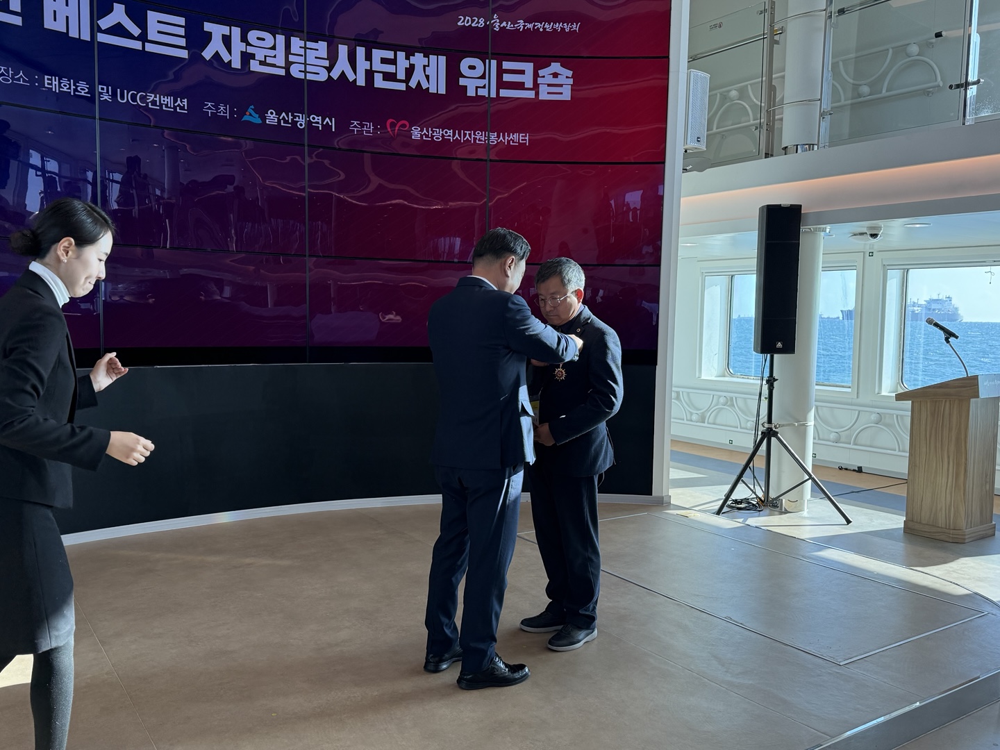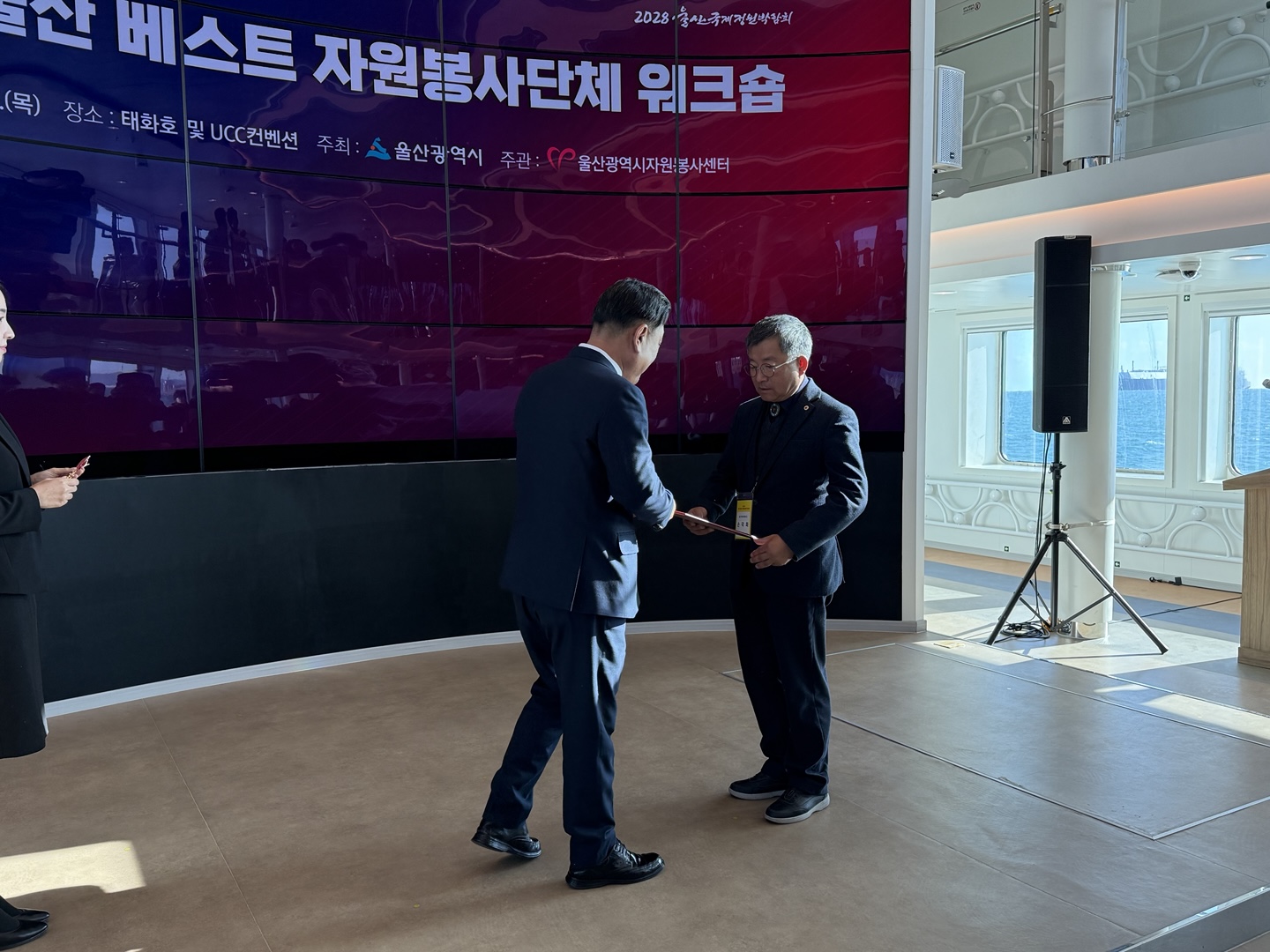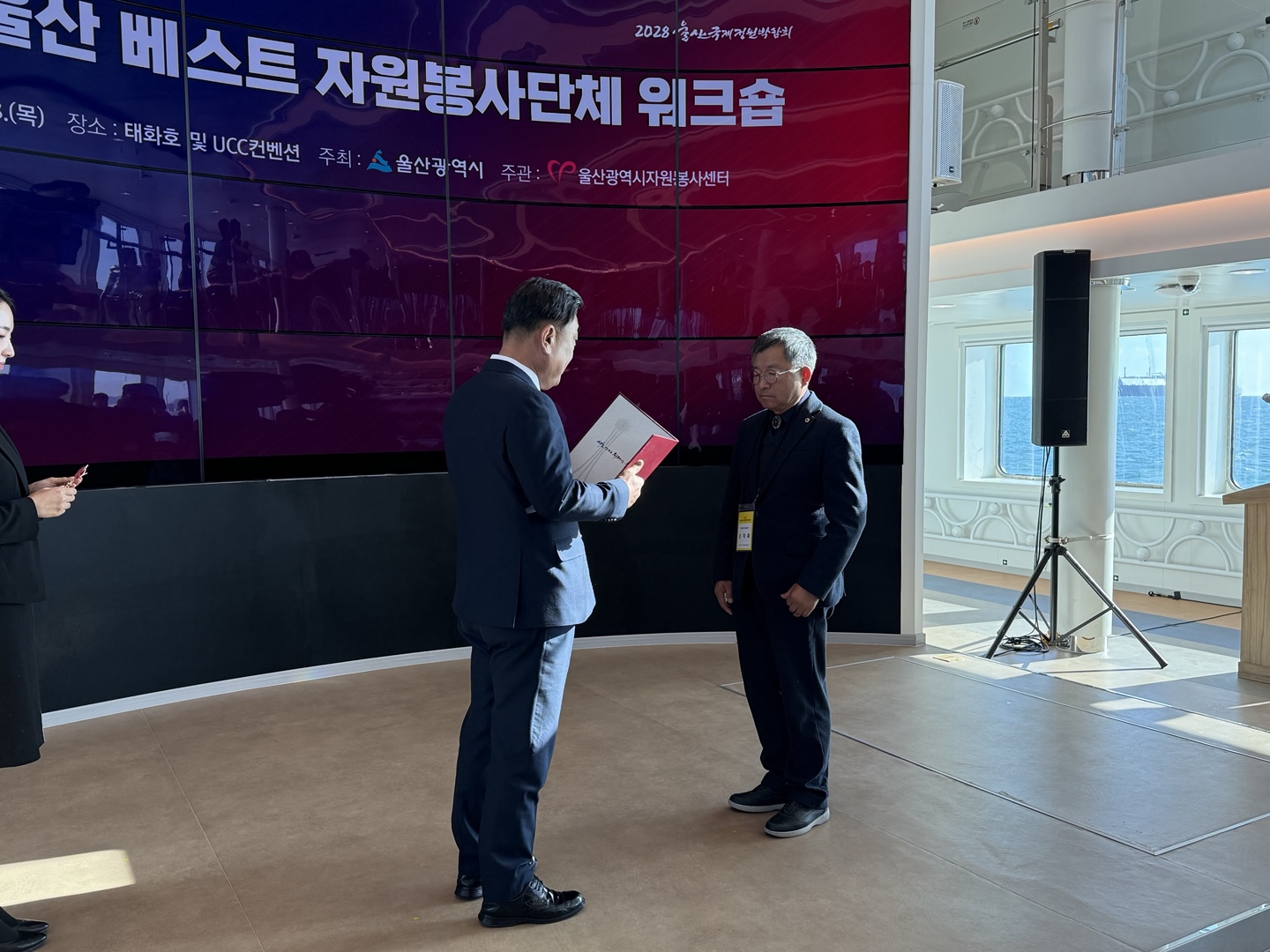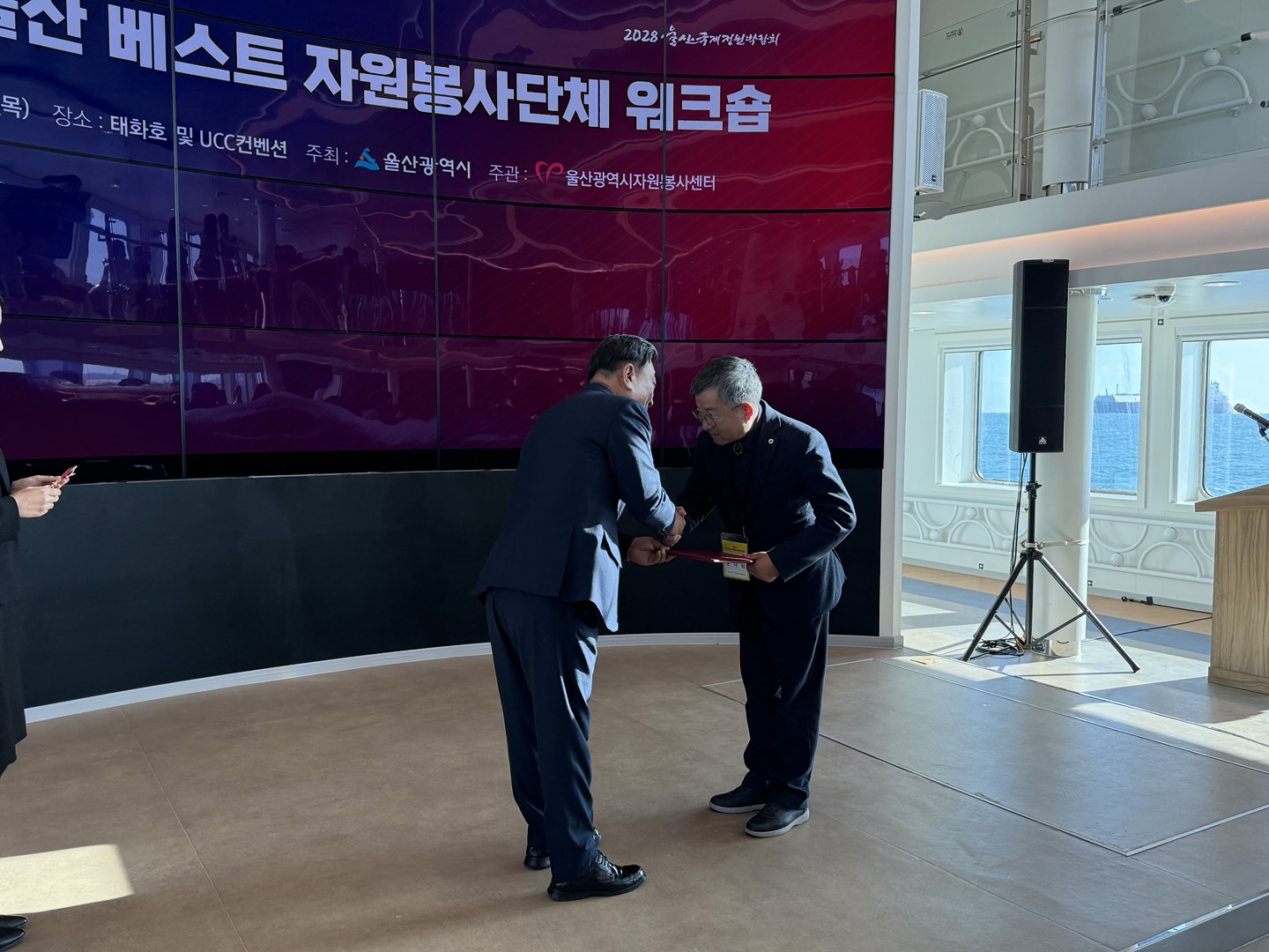 2024.11.28. 이날 장생포에서 수소연료인 지능형선박 울산태화호에서 2024 울산 베스트 자원봉사단체 10곳에 시상식이 있었다. 울산미래사회봉사단은 사랑을 베푸는 사람들(대상) 단체 다음으로 최우수단체에 선정되어 손덕화단장님외 몇분들이 시상식에 참여 하였고 손덕화단장님이 대표로 시상을 하였다. 울산미래사회봉사단원으로서 2024년 올 한해 자원봉사한것에 대해 보람을 느끼게 하는 날이 되었다.